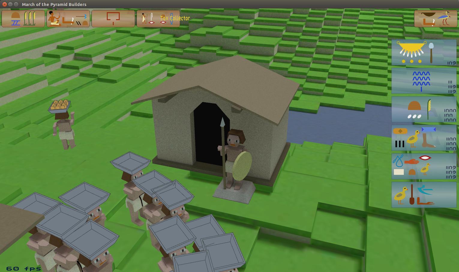 I've introduced the concept of both 'Silver' and 'Tax Collector' to the game. So far, silver only has a hieroglyph statistics title. For the Tax Collector, I made a hieroglyph, I designed a 3D model of a building with a guard using Wings3D. I generated a lightmap for this building using Blender.