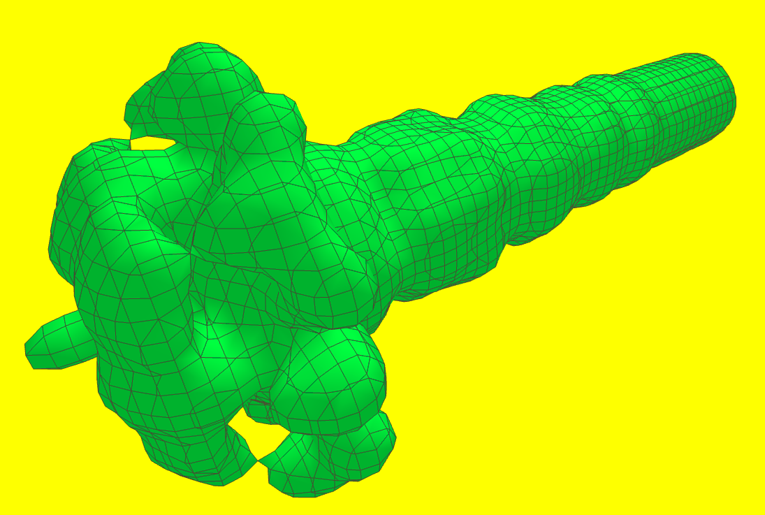 To reassemble the polygons from the triangles, I used my trusty Python interpreter. Nothing beats Python in productivity for complex processing. For posterity, here is the source code for reassembling most of the cases. The basic idea behind the code is to fuse triangles that share a common edge.