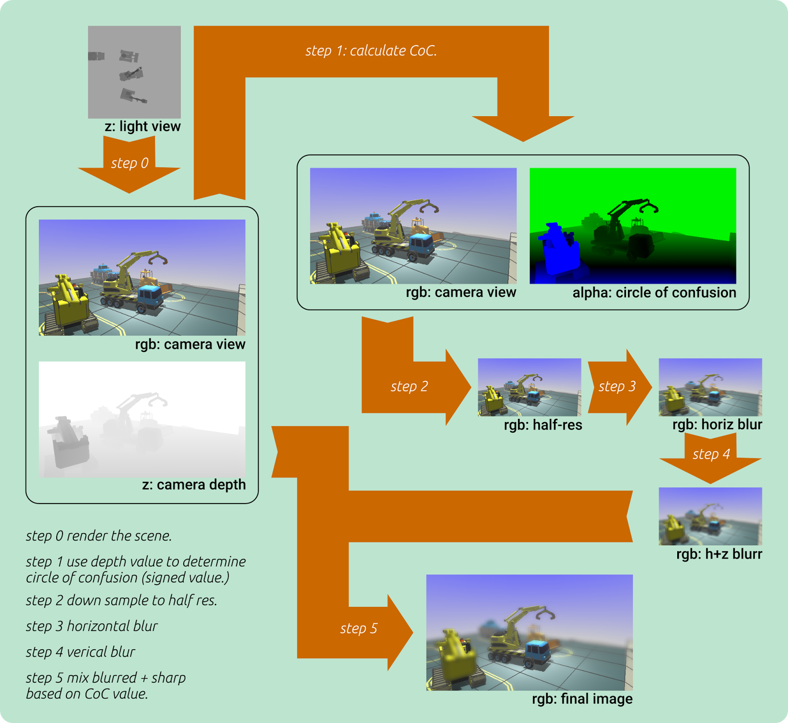 In step 1, the input image is copied but in the alpha channel, a Circle-of-Confusion size is stored. To calculate this size, the depth of the pixel is compared to the focal distance. This CoC size is a signed value which controls the blurriness. The value is 0.0 when it is perfectly in focus, it is -1 if it is in the foreground and requires maximum blur. When it is +1, it is also maximally blurred, but this time because it is in the far background. Intermediate results are for moderately blurred pixels.